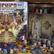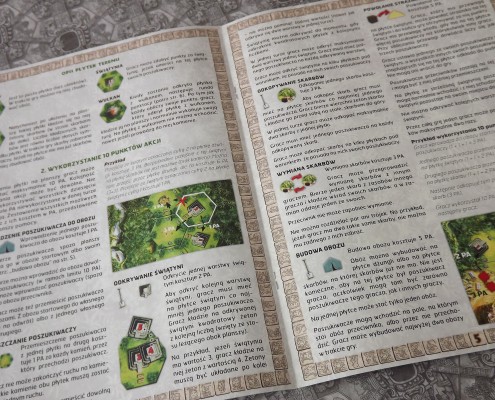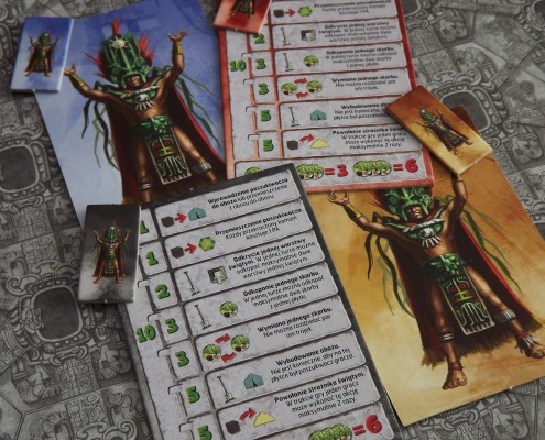 Warto przyjrzeć się również samemu wydaniu gry. Przede wszystkim główną zmianą w stosunku do pierwotnej wersji jest standaryzacja rozmiarów pudła, które jest znacznie bardziej kompaktowe od oryginału. Odświeżona została również sama szata graficzna, za którą odpowiada Mariusz Gandzel – kolory stały się jaśniejsze, a ikonografia czytelniejsza. Na plus zdecydowanie należy zaliczyć też planszę, która jest bardziej szczegółowa i atrakcyjna. O ile od strony graficznej nie można mieć żadnych zastrzeżeń, tak kwestia czysto techniczna wypada już nieco gorzej. Kafelki są nieco cieńsze, choć nadal sztywne i wytrzymałe, a nadruk na rewersie niektórych kafli jest wyraźnie przesunięty. Problemy występują również z wypraską z żetonami. Ich sztancowanie jest bardzo kiepskie, co podczas wypychania żetonów spowodowało lekkie naderwanie faktury dwóch świątyń, które musiałem podkleić. Dawno już, tak pozornie prosta czynność, nie sprawiła mi tyle kłopotów. Poza wspomnianymi problemami, elementy są dobrej jakości i z pewnością przetrwają wiele rozgrywek.