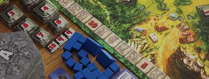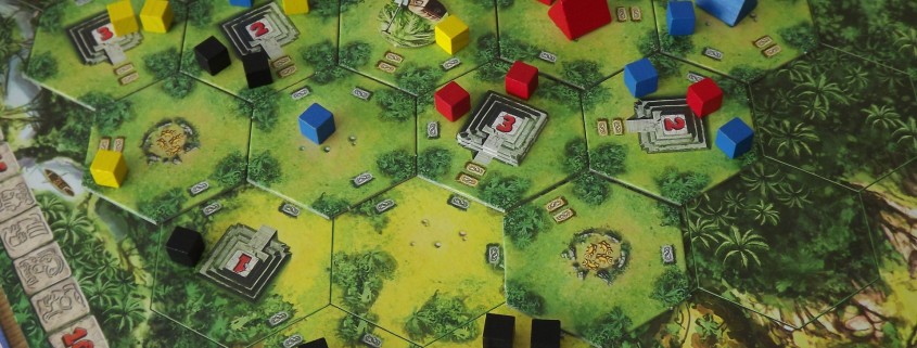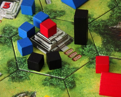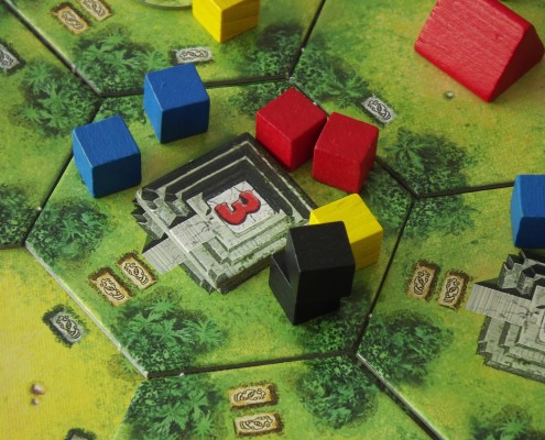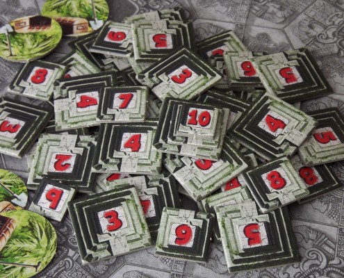 Tak skonstruowany system punktacji sprawia, że w trakcie rozgrywki nieustannie trwają przepychanki i walki o świątynie, a dodatkowo jeden obiekt może punktować nawet dla kilku graczy. Bardzo istotna jest również kolejność, w jakiej będziemy przeprowadzać swoje tury i podliczać punkty. Pierwszy gracz ma zawsze najłatwiej jeśli chodzi o przejęcie kontroli nad daną świątynią, zaś każdy kolejny – chcąc również zdobyć punkty z tej samej budowli – musi dołożyć coraz więcej swoich poszukiwaczy. Jak już wcześniej wspominałem, kafelki dzielą się na grupy. Dzięki temu wiedząc, że wulkan znajduje się w grupach B, D i F możemy odpowiednio przygotować się do punktacji, ale zawsze pozostanie pewna doza niepewności i napięcia (Czy zdążę jeszcze wybrać się po skarby? Czy warto starać się odbić świątynię? A może, nie ryzykując, rozbudować kontrolowane już świątynie?)