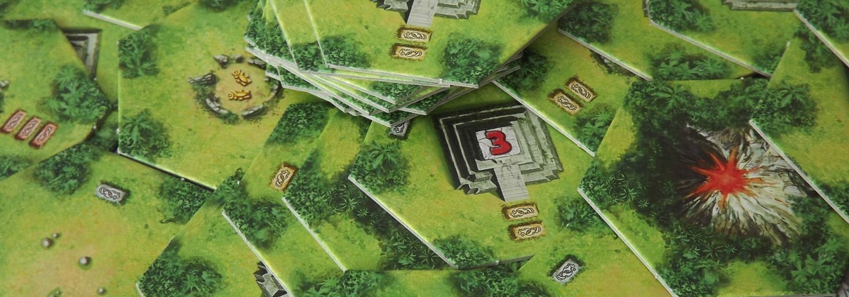 Na początku każdej tury będziemy odkrywać wierzchni kafelek stosu i dokładać go na planszę, tworząc tym samym coraz to większy obszar dżungli. Na płytkach znajdziemy świątynie, które będą przynosiły nam punkty zwycięstwa, źródła również punktujących skarbów, puste obszary dżungli, gdzie będziemy mogli założyć obóz oraz wulkany, o których opowiem nieco później. Kafelki oznaczone są również specjalnymi kamieniami, których będziemy się poruszać, dlatego należy pamiętać, że płytki muszą być układane w taki sposób, aby prowadził do niej przynajmniej jeden kamień.