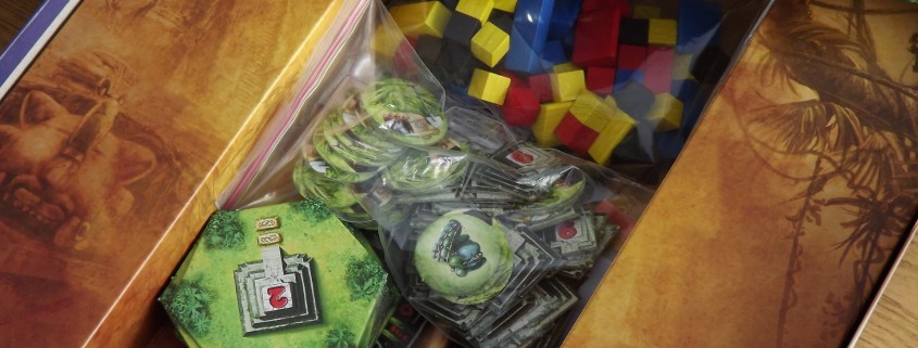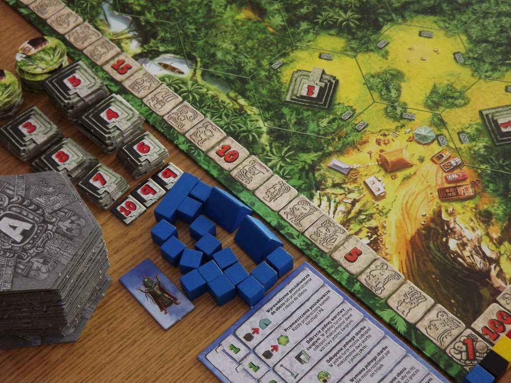 Do rozgrywki w Tikala przystępujemy naprawdę błyskawicznie, a przygotowanie mieści się w kilku prostych krokach. Wystarczy tylko rozłożyć planszę, przygotować stos kafelków dżungli, ułożonych według grup (od A do G) i wymieszać żetony skarbów, które będziemy zdobywać w trakcie partii. Dalej gracze już tylko pobierają zestaw komponentów w odpowiadającym im kolorze – pionki poszukiwaczy, dowódcę, obozy oraz płytkę pomocniczą z opisem wszystkich dostępnych w grze akcji. W ten oto sposób jesteśmy gotowi, aby rozpocząć wyprawę badawczą.