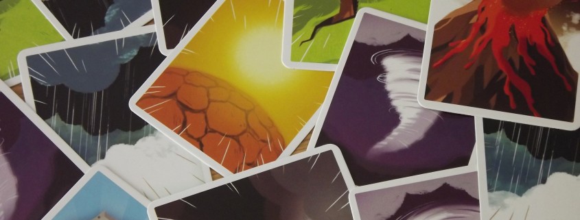 Muszę przyznać, że po pierwszych partiach w Gaję rozgrywka okazała się zbyt statyczna i monotonna – plansza w trakcie gry nie zmienia się, interakcja jest minimalna, a raz postawione miasta oraz obecni w nich osadnicy, bardzo często pozostają na swoim miejscu do końca partii. Na szczęście gra zawiera zasady zaawansowane, które znacznie ubarwiają nam zabawę. Pierwsze dwie modyfikacje dotyczą samych miast. Od teraz, gdy podnosimy poziom zadowolenia w cudzym mieście, nie tylko umieszczamy w nim swojego osadnika, ale usuwamy też pionek naszego przeciwnika. Z kolei, gdy zaspokoimy wszystkie cztery potrzeby miasta możemy dołożyć do niego kolejnego, drugiego meepla. Obraz rozgrywki jeszcze bardziej zmieniają karty żywiołów, które możemy standardowo dobierać w trakcie partii. Za ich pomocą ukradniemy karty rywalom, podmienimy włożone na stół kafelki terenu, zamienimy je miejscami czy też jednym zagraniem, całkowicie zniszczymy miasta. Prawdziwą bombą wśród tychże kart jest Wulkan, który nie dość, że usuwa z wybranego kafelka gór miasto oraz obecnych w nim osadników, to na dodatek zamienia wszystkie sąsiadujące tereny dookoła w pustynie. Uwierzcie, z żywiołami i zasadą przejmowania miast, Gaja staje się zupełnie inną, momentami wredną grą.